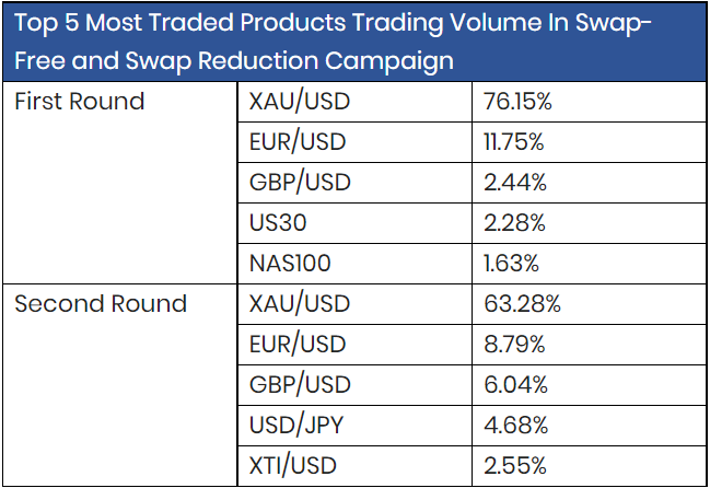 In comparison with the previous round of Swap-Free and Swap Reduction Campaign, the most traded products for this round of campaign were XAU/USD, EUR/USD, GBP/USD, USD/JPY followed by XTI/USD.
