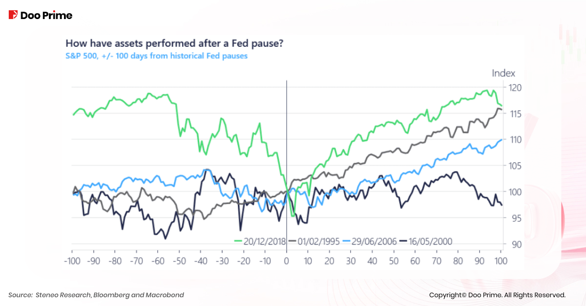 In simple terms, suspending interest rate hikes tends to have a negative effect on the dollar, whereas resuming them generally strengthens the currency. However, based on the Federal Reserve’s previous rate hike patterns, the dollar experiences a period of suspension and subsequent decline before the actual resumption of rate hikes, followed by a subsequent rise.