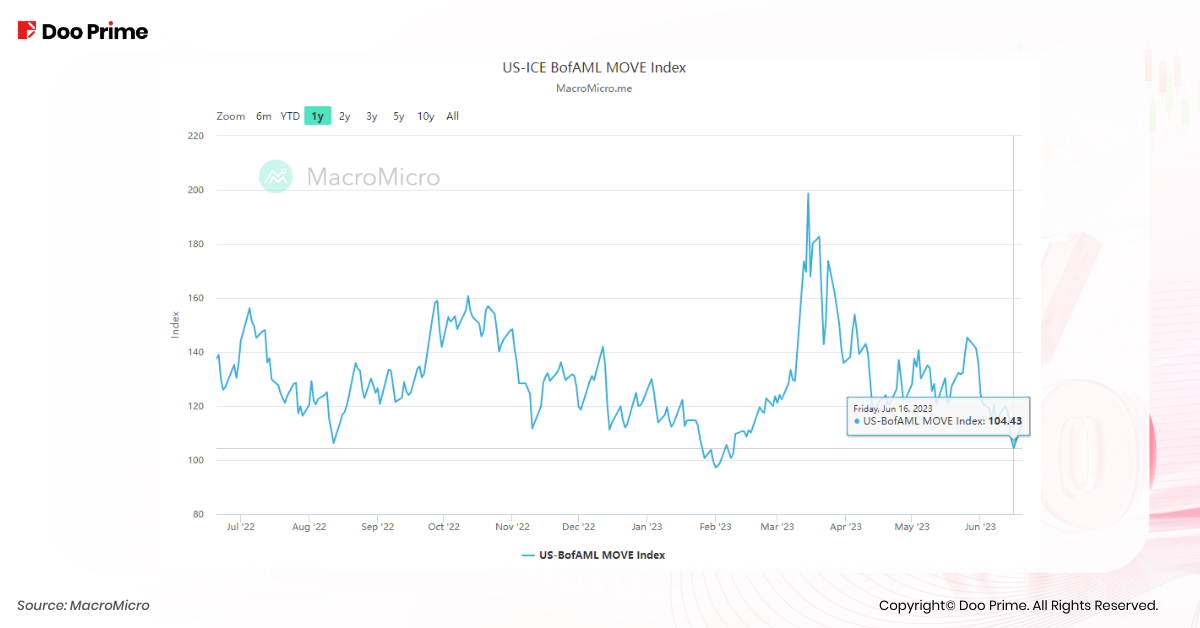 Following the Federal Reserve’s announcement of a pause in rate hikes, the Merrill Lynch Option Volatility Estimate (MOVE) index, a reliable gauge of anticipated volatility in U.S. Treasuries, descended to 104.43 on June 16th, nearing its lowest point preceding the onset of the Fed’s tightening cycle. This trajectory signifies a stable bond market sentiment and mitigates the likelihood of a sell-off.