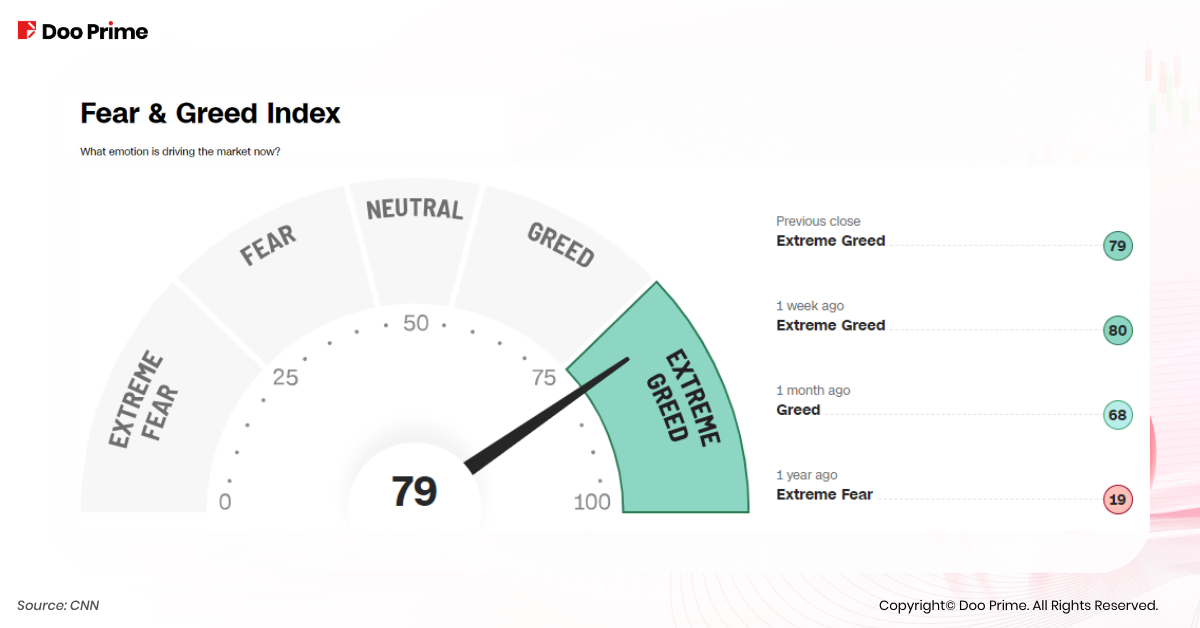 Warren Buffett once said that it is wise for investors to be “fearful when others are greedy, and greedy when others are fearful.” The Fear & Greed Index, a comprehensive measure of market sentiment, has recently climbed to 79, indicating an increased level of investor greed. However, crossing the threshold of 90 signifies over-optimism and the potential for market overheating.
