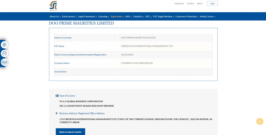 You may perform the verification through a search on Mauritius FSC Services Register. Let’s use Doo Prime Mauritius Limited as an example here.