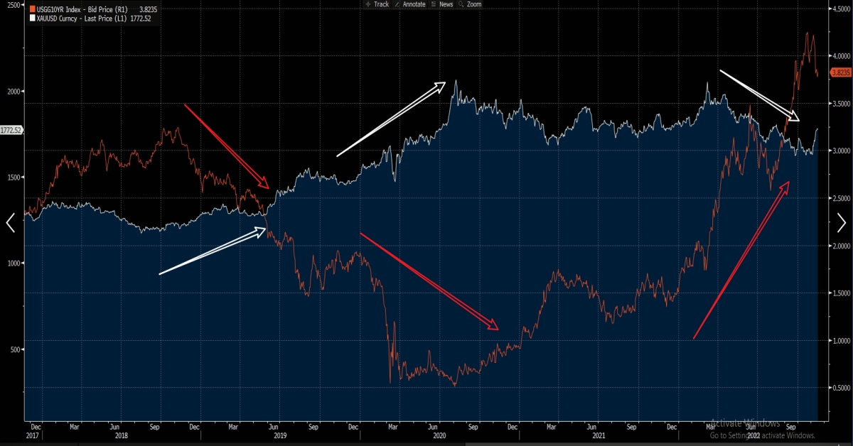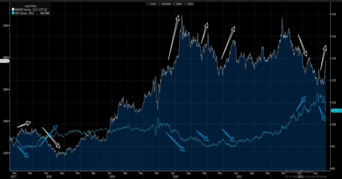 The chances of the Fed slowing down the pace of interest rate hikes in the future will directly affect the next move of the U.S. dollar. As we have explained above, since gold tends to have a negative correlation with the U.S. dollar, if the U.S. dollar starts to fall, it will be good for gold in the short term.