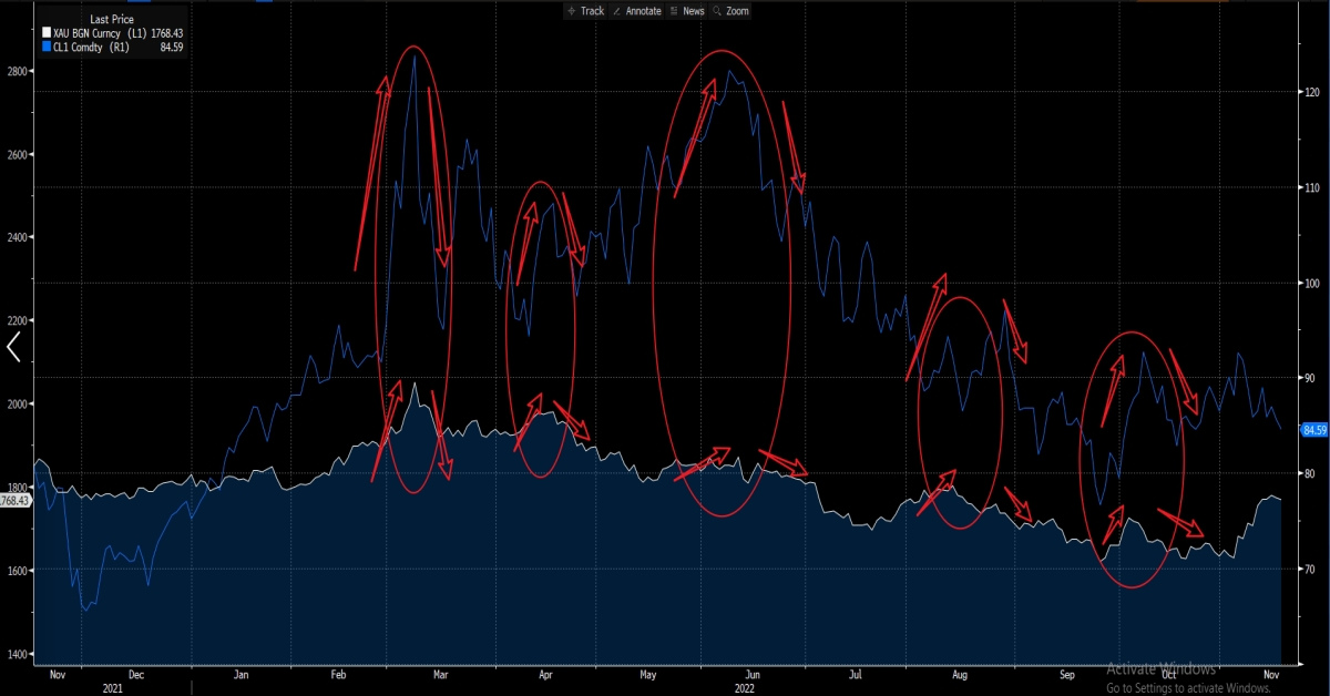 As we can see from the figure below, the price movements of crude oil and gold, which are both hard currencies, show a similar positive correlation.