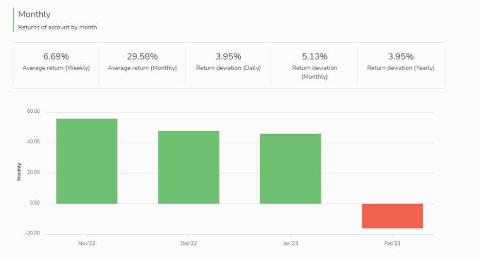 The monthly returns of “EURUSD Expert” (EURUSD短线小能手) is equally remarkable. In November 2022 alone, the return was an outstanding 55.78%. Although the “EURUSD Expert” (EURUSD短线小能手) focuses primarily on the EUR/USD currency pair, its returns in February were slightly lower due to the fluctuating USD exchange rate following news of the Fed’s hawkish stance. Nevertheless, the average monthly return of the “EURUSD Expert” (EURUSD短线小能手) to date has been an impressive 29.58%.