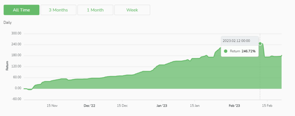 The “EURUSD Expert” (EURUSD短线小能手) trading signal feed was established on 3rd November 2022, and has consistently yielded impressive returns since its inception. In fact, by 13th February 2023, the return had reached an all-time high of 246.72%, a mere three months after its launch.