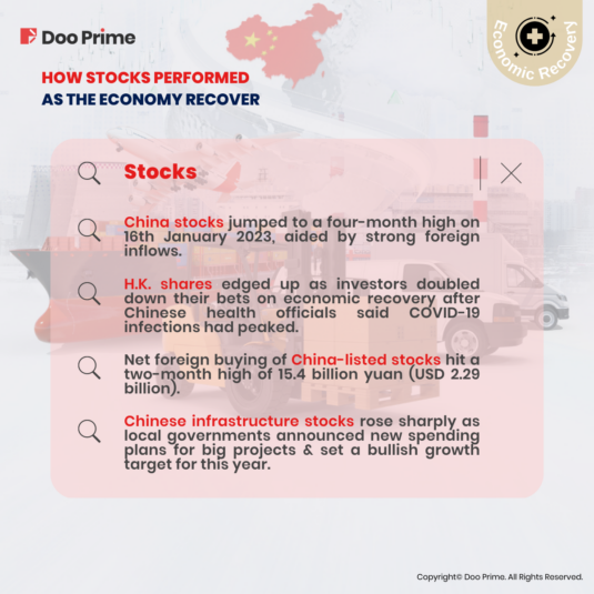 China stocks jumped to a four-month high on 16th January 2023, aided by strong foreign inflows, while Hong Kong shares edged up as investors doubled down their bets on economic recovery after Chinese health officials said COVID-19 infections in the country had peaked.