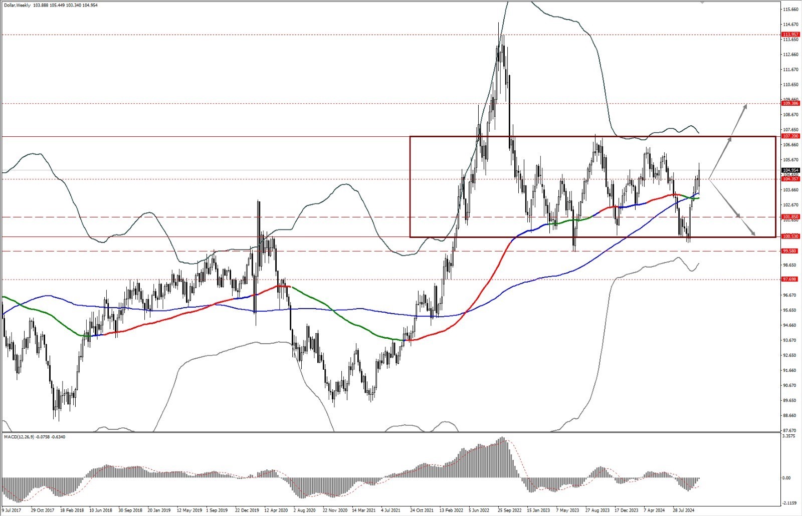 • 如果美指稳定运行于 104.35 一线上方,则多方偏强势,届时依次关注宽幅震荡区间上边界 107.20 和 109.38 两个位置的压制力度;