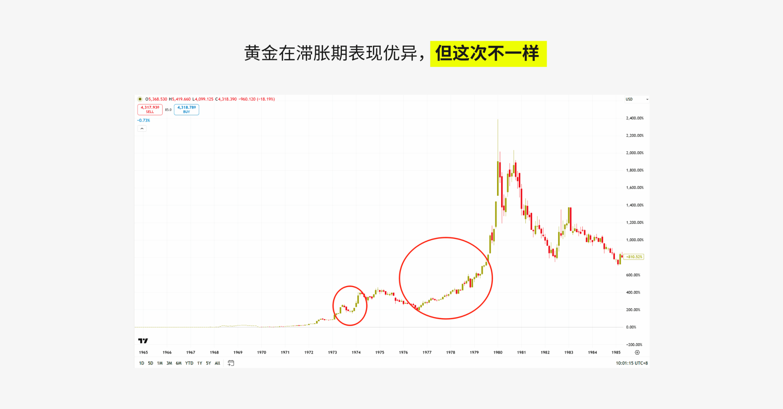 黄金的表现也很抢眼,在这两轮滞胀期间,黄金、大宗商品均受益于通胀而有所上涨。然而 D Prime 认为,研究历史不能只看表象,因为很明显的是,本次黄金走势却不尽人意。究其原因在于,当时的大背景是美元贬值,而弱美元支撑了强黄金,但这一次,由于资金预期美联储会加息,反而使得美元变得强势,而强美元吸走了黄金的资金。
