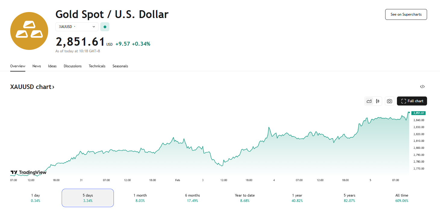 近期因各国关税政策带来的不确定性,推动市场的避险情绪升温,现货黄金周二再创历史新高至 2845.30 美元/盎司,为连续四个交易日刷新历史高点,收报 2841.85 美元/盎司;美国黄金期货收盘上涨 0.7% 至 2,875.80 美元。2 月 5 日截至发稿,现货黄金升破 2850 美元/盎司。