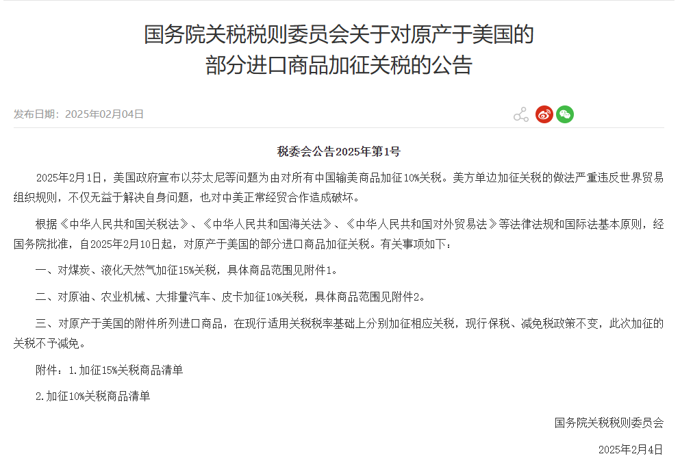 2 月 4 日,中国国务院关税税则委员会发布公告,自 2025 年 2 月 10 日起,对原产于美国的部分进口商品加征关税,包括对煤炭、液化天然气加征 15% 关税,对原油、农业机械、大排量汽车、皮卡加征 10% 关税;此外,对原产于美国的附件所列进口商品,在现行适用关税税率基础上分别加征相应关税,现行保税、减免税政策不变,此次加征的关税不予减免。