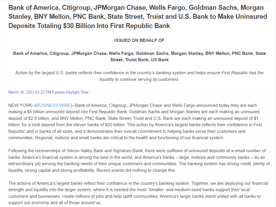 另一边厢,出手救市的不仅美国监管机构,美国六大行领衔的 11 家华尔街大型银行也于 3 月 16 日向第一共和银行( First Republic Bank )注入 300 亿美元资金,以防止地区银行业危机进一步蔓延。这场救援行动是由银行方面主动发起的,但得到了政府的大力支持和鼓励。