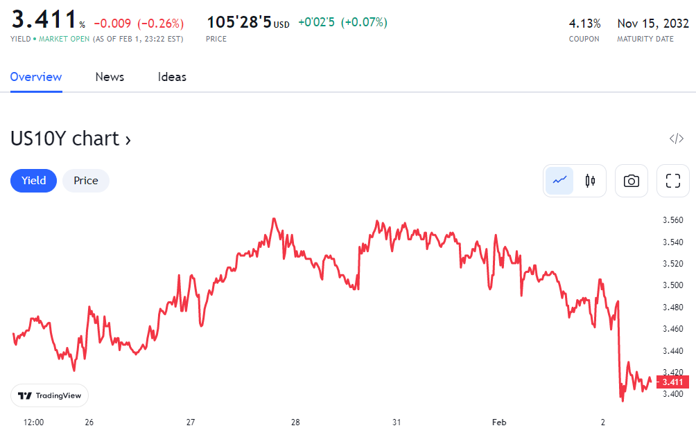10 年期美债收益率一度继续收窄至跌 3 个基点,上逼 3.50%;2 年期收益率涨幅重回 4 个基点至 4.25%。但 10 分钟内,美债收益率跌幅重新扩大,10 年期收益率日内跌幅扩大至 12 个基点至 3.41%,2 年期收益率抹去全部涨幅,转跌并失守 4.20%,日内跌 9 个基点至 4.11%。
