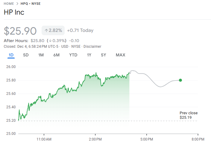12 月 4 日至 5 日,惠普公司 (HPQ) 公布第四季度财报,营收同比增长 14.7% 至 97 亿美元,低于市场预期的 99 亿美元;每股盈余 (EPS) 为 0.62 美元,高于市场预期的 0.58 美元。