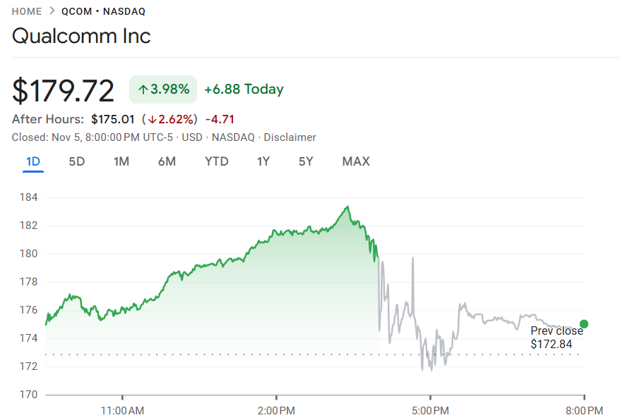 尽管前景指引积极,但市场反应偏谨慎,高通股价在盘后交易中下跌约 2.5%。