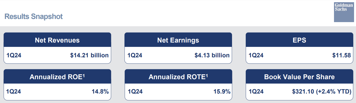 高盛(GS)发布了第一季度财务报告,营收达到了 142 亿美元,超过了市场预期的129亿美元。每股收益为 11.58 美元,也高于预期的 8.68 美元。这主要归功于债务承销业务的增长,使得投资银行收入达到了 20.8 亿美元,比去年增长了 32%。除此之外,公司的其他部门也都取得了增长。