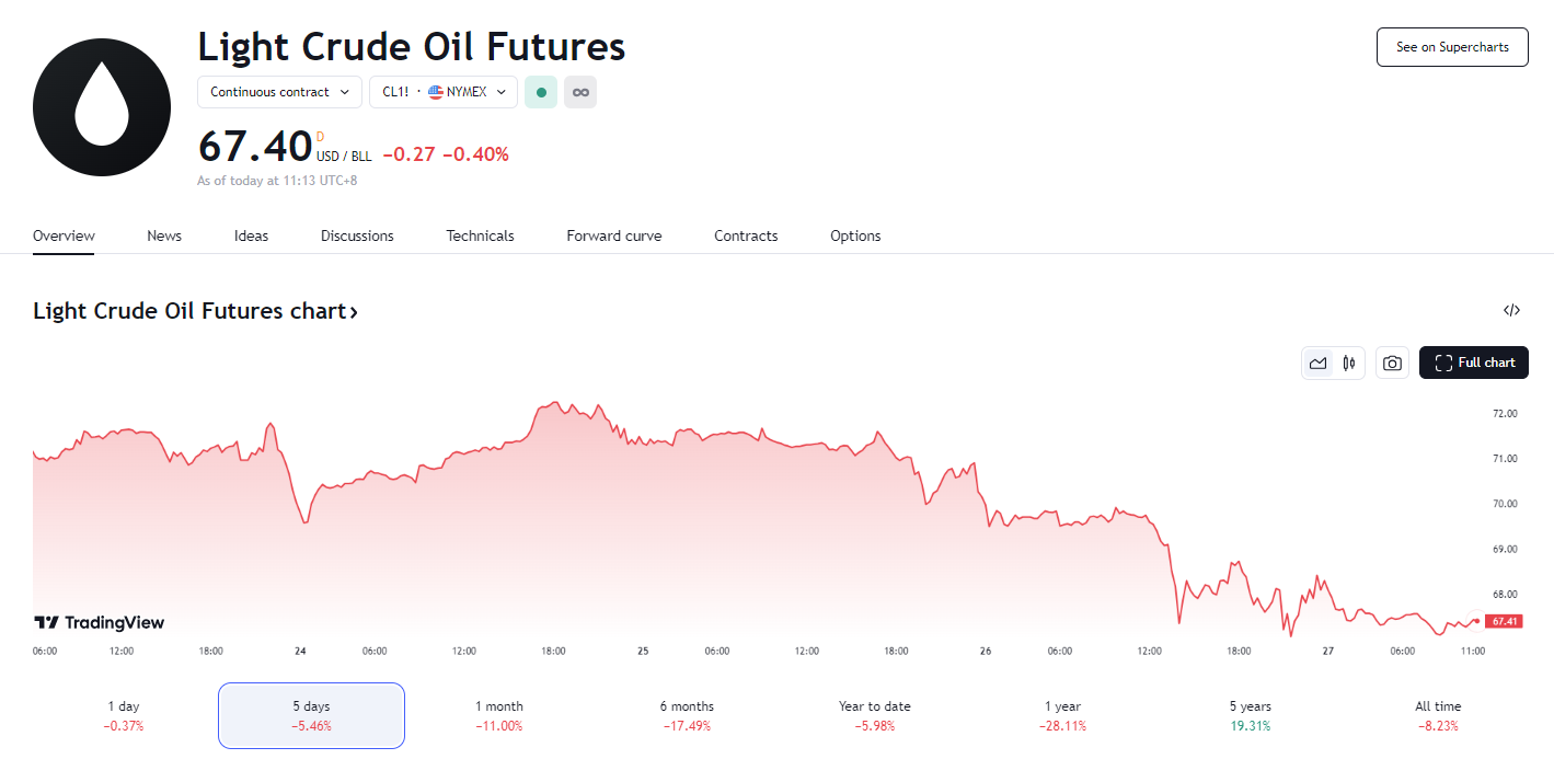 产量大增的消息传出后,国际油价一度大跌超过 3%,创下逾两周新低。26 日,布伦特原油期货结算价下跌 1.86 美元,或 2.53%,至每桶 71.60 美元。美国原油收跌 2.02 美元,跌幅 2.90%,报每桶 67.67 美元。
