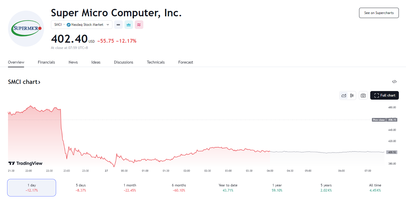 据悉,超微电脑的一名前雇员指控该公司会计违规,美国司法部正对此展开调查。这一消息令超微电脑(SMCI)短线跳水,由盘初涨 5.7% 迅速转跌,一度大跌近 17%,因跌幅过大而数次停牌,最终收跌 12% 至 402.40 美元,创下 8 月 28 日做空机构兴登堡研究发布报告以来最大跌幅。