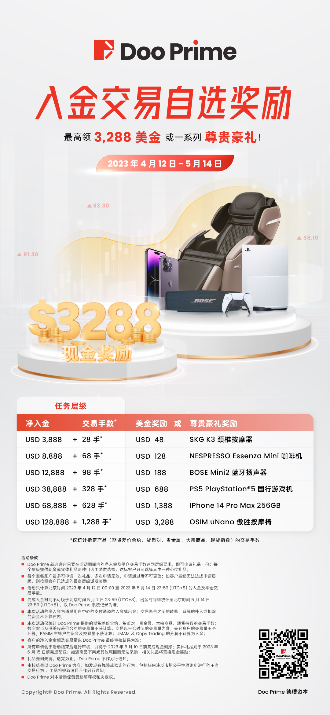 本次活动参与条件非常简单,只要您在北京时间 2023 年 4 月 12 日 0:00 起至 5 月 14 日 23:59 ( UTC+8)期间 ,满足最低净入金 USD 3,888 及平仓 28 手,即可联系客户经理申请奖品。如无客户经理,您可通过官网客服或电邮至 cn.support@dooprime.com 进行报名。奖品有限,立即完成任务,领取心仪礼品吧!