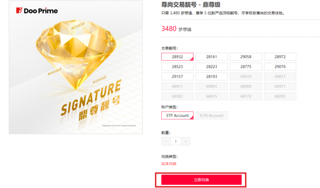 即日起,Doo Prime 客户只要 1,080 梦想值就可兑换并开通尊尚交易靓号。靓号先到先得,兑换次数不设上限,诚邀广大客户一同开展个性化的升级交易体验!