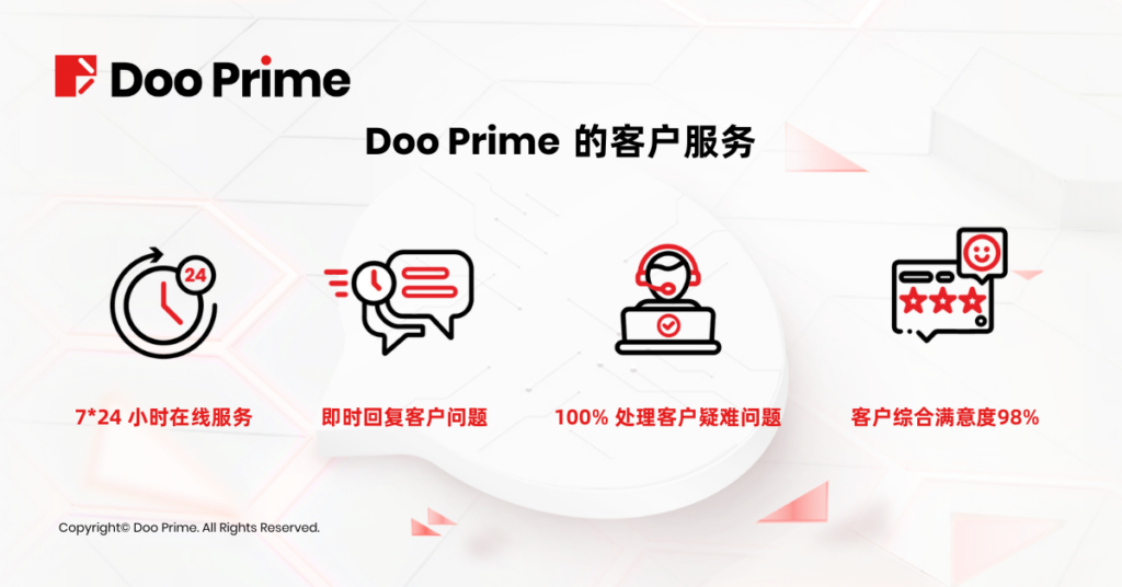为更好地服务来自全球各地的客户,Doo Prime 提供 7 * 24 小时多语言客户服务,全天候为您提供帮助。