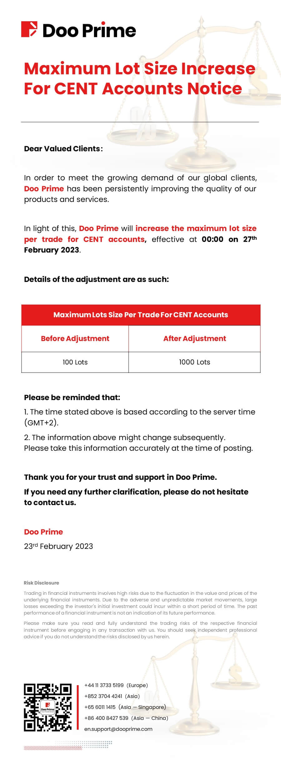 Doo Prime Maximum Lot Size Increase For CENT Accounts Notice