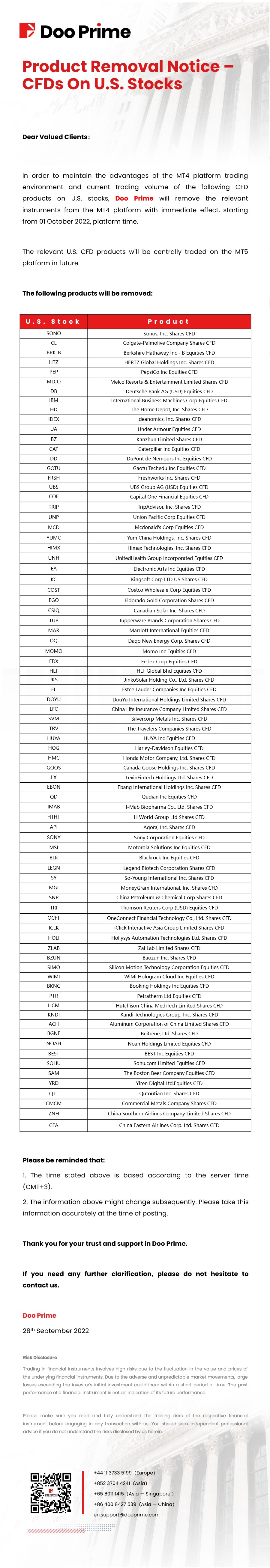 Doo Prime Product Removal Notice – CFDs On U.S. Stocks