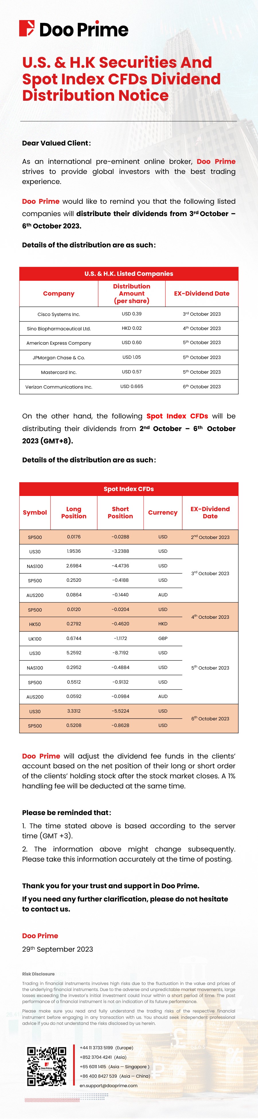 Doo Prime U.S. & H.K. Securities And Spot Index CFDs Dividend Distribution Notice