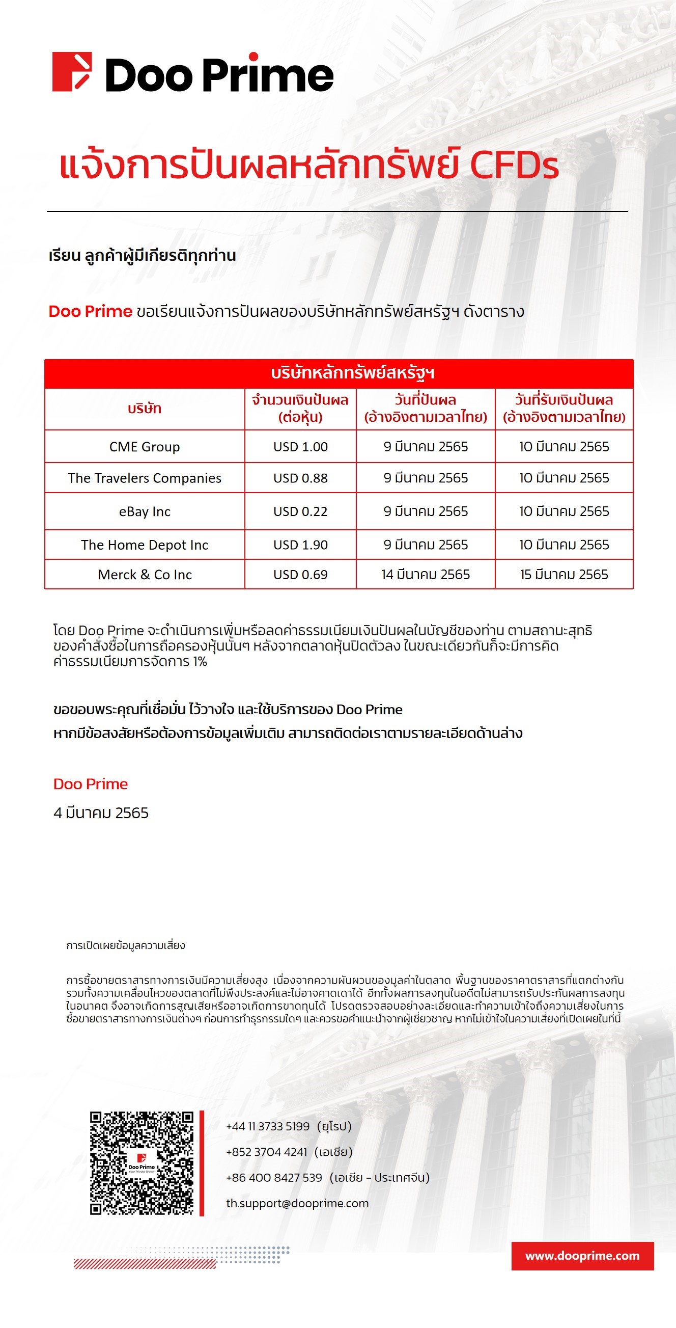 Doo Prime ประกาศแจ้งการปันผลหลักทรัพย์ CFDs