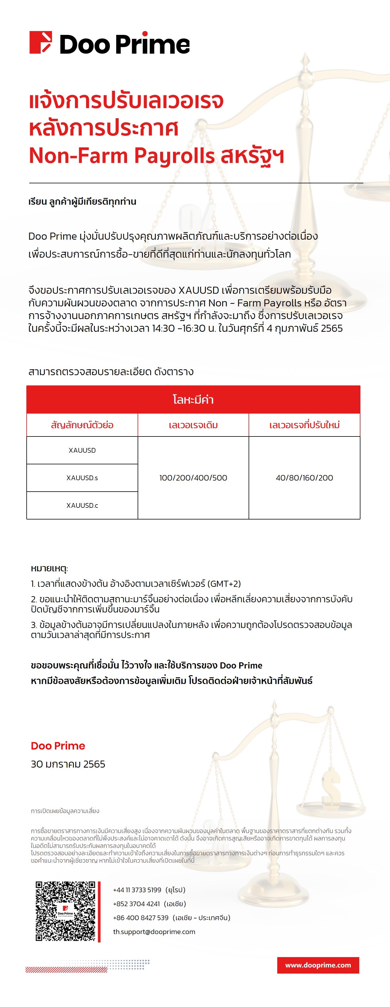 Doo Prime แจ้งปรับการปรับเลเวอเรจหลังประกาศ Non – Farm Payrolls