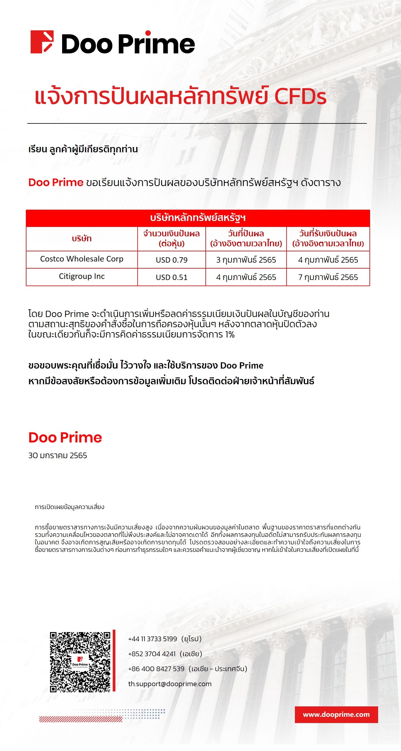 Doo Prime แจ้งปันผลหลักทรัพย์ CFDs
