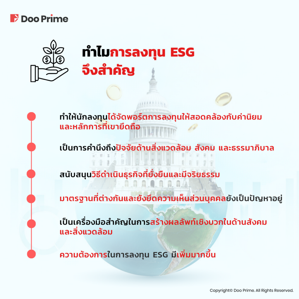 โดยภาพรวมแล้ว การลงทุน ESG เป็นเครื่องมือสำคัญสำหรับนักลงทุนที่ต้องการปรับการลงทุนให้สอดคล้องกับคุณค่าและสร้างผลกระทบเชิงบวกต่อสังคมและสิ่งแวดล้อม เมื่อผู้คนจำนวนมากขึ้นตระหนักถึงผลกระทบต่อสิ่งแวดล้อมและสังคมจากการลงทุน ความต้องการในการลงทุน ESG ก็มีแนวโน้มที่จะเติบโตอย่างต่อเนื่อง
