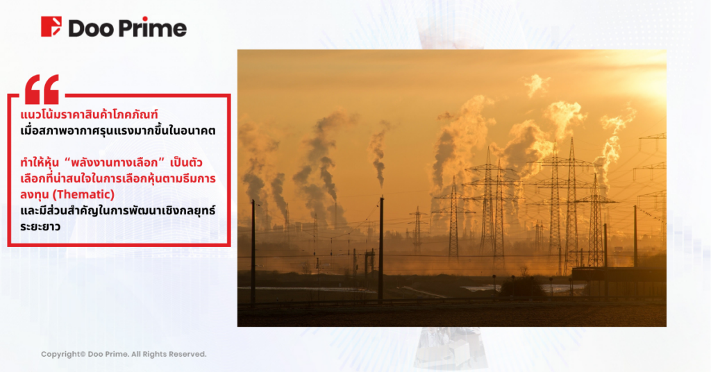 สภาพอากาศที่รุนแรงนี้เป็นตัวส่งสัญญาณเตือนความมั่นคงด้านพลังงานในอนาคต ความมั่นคงด้านอาหาร และความมั่นคงด้านสิ่งแวดล้อมของทุกประเทศอย่างไม่ต้องสงสัย สิ่งเหล่านี้สะท้อนให้เห็นในสภาพตลาดการเงิน และแน่นอนราคาของสินค้าโภคภัณฑ์ย่อมได้รับผลกระทบจากสภาพอากาศที่รุนแรง นี่จึงทำให้กลุ่มหุ้นที่เกี่ยวกับ “พลังงานทางเลือก” อาจมีความสำคัญในการพัฒนาเชิงกลยุทธ์ในระยะยาว