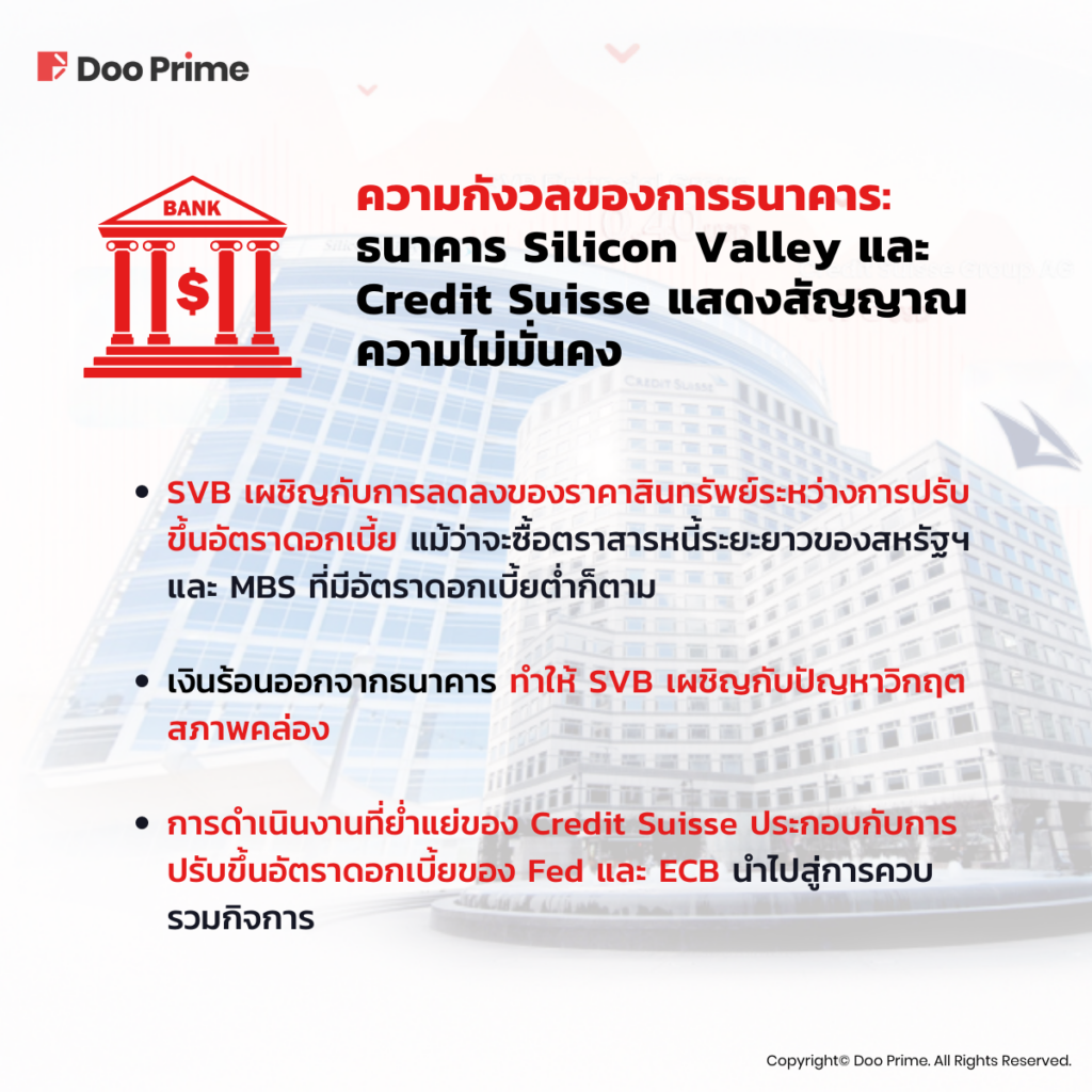 เมื่อวันที่ 10 มีนาคม 2023 ที่ผ่านมา ธนาคารแห่งซิลิคอนวัลเลย์ (SVB: Silicon Valley Bank) ซึ่งครั้งหนึ่งเคยเป็นธนาคารที่ใหญ่เป็นอันดับที่ 16 ของประเทศ ได้ประกาศถึงการล้มละลายของธนาคารอย่างกระทันหันหลังจากที่ผู้ฝากได้ถอนเงินออกจำนวนมาก และไม่กี่วันต่อมา ธนาคาร Credit Suisse ซึ่งเป็นวาณิชธนกิจชั้นนำที่มีประวัติยาวนานกว่า 100 ปี ได้เลื่อนการประกาศรายงานผลประกอบการประจำปี 2022 ออกไป สร้างความตื่นตระหนกกับเรื่องตัวเลขการเงินของธนาคาร ส่งผลให้ราคาหุ้นของธนาคารดิ่งลง ในท้ายที่สุด UBS ได้เข้าซื้อกิจการธนาคาร Credit Suisse ด้วยเงิน 3 พันล้านฟรังก์สวิส โดยมีรัฐบาลสวิสเป็นตัวกลางในการเจรจา