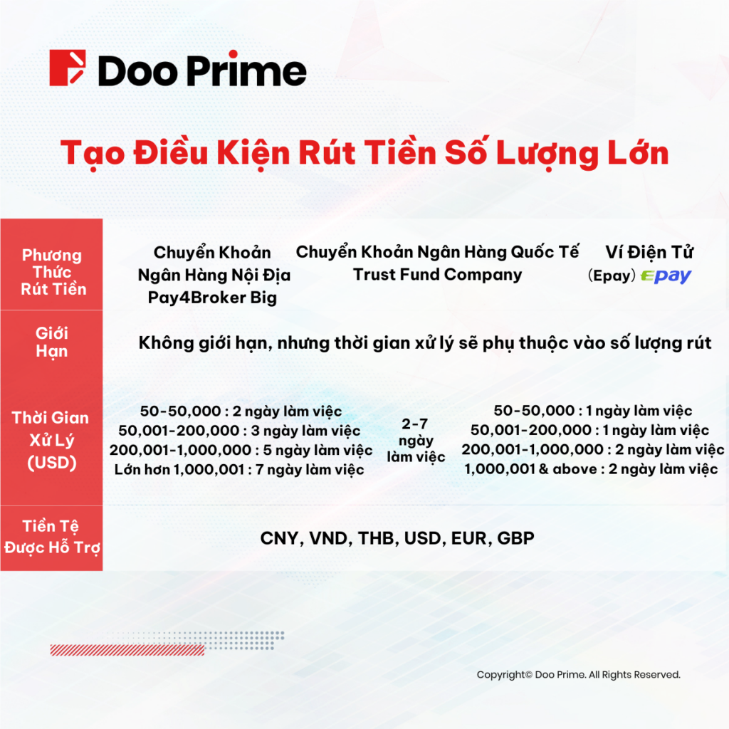 Chính vì thế, tại Doo Prime, chúng tôi cung cấp một loạt các tùy chọn, trong đó bao gồm chuyển khoản ngân hàng nội địa và chuyển khoản ngân hàng quốc tế, với khả năng rút tới 159,000 USD trong một giao dịch bất kỳ từ ngân hàng nội địa và 228,682.42 USD từ ngân hàng quốc tế. Riêng về phía Doo Prime, đội ngũ chuyên gia của chúng tôi cam kết làm việc hết mình nhằm xử lý các yêu cầu rút tiền từ khách hàng một cách nhanh chóng và an toàn, từ đó đảm bảo rằng quỹ của khách hàng luôn có thể truy cập được khi cần.
