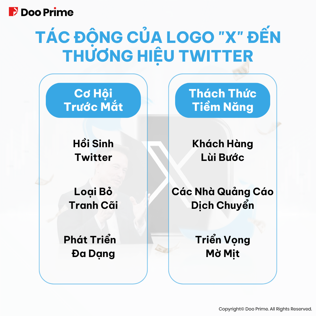Động thái làm mới thương hiệu của Twitter, từ hình tượng “Chú Chim Xanh” qua “Ký Tự X” có khả năng tác động mạnh mẽ đến giá trị thương hiệu. Tuy nhiên, vẫn còn quá sớm để đưa ra bất kỳ kết luận nào về tương lai của nền tảng này. Điều duy nhất chúng ta có thể chắc chắn trong thời điểm hiện tại là, dưới sự dẫn dắt của Musk, số phận của Twitter, hoặc sẽ đột phá không tưởng, hoặc sẽ “tụt dốc không phanh”.