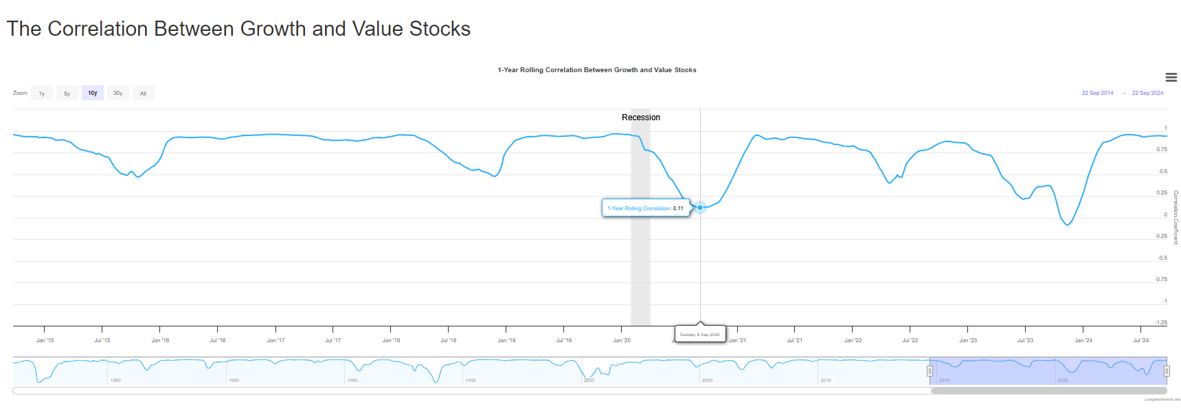 Đây là biểu đồ cho thấy hệ số tương quan (correlation coefficient) trong việc so sánh chỉ số MSCI USA Growth Index (cổ phiếu tăng trưởng) và MSCI USA Value Index (cổ phiếu giá trị). Có thể thấy, trong bối cảnh kinh tế đại dịch, cổ phiếu giá trị và cổ phiếu tăng trưởng đã có hiệu suất trái chiều, khiến tỉ lệ chạm gần mức “negative”.